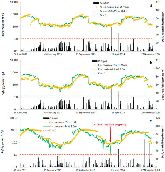 Comparison of the safety factor obtained from the measured and modeled values of the degree of the soil saturation during the monitoring time span at various depths belowthe ground level: (a) 0.4 m; (b) 0.6 m; and (c) 1.0 m.