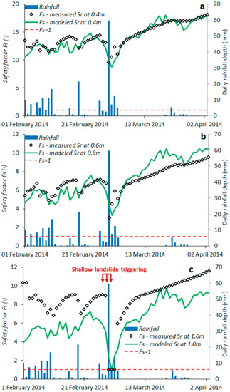 Regarding the shallow landslide occurring between 28 February 2014 and 2 March 2014, both the Fs trends correctly identified the triggering time 1m belowthe ground surface, where the sliding surface actually developed (Figure 8 and Figure 9). In particular, unstable conditions were attained for three days, 1–3March2014, by the Fs trend from the measured Sr but only for one day, 2 March 2014, by the Fs trend from the modeled Sr (Figure 9).