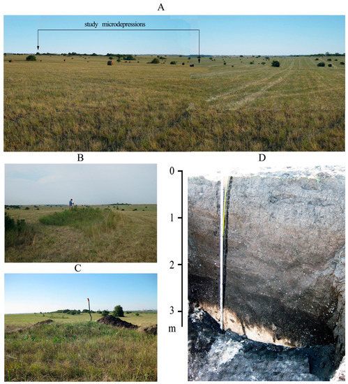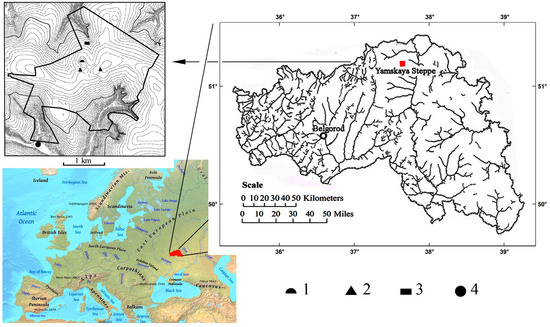 The Yamskaya steppe site (37°20′59.62′′ E, 50°57′48.77′′ N) belongs to the State Natural Reserve “Belogorie” and is the only surviving natural fragment of meadow-steppe landscape of typical forest-steppe of the Central Russian Upland (Figure 1). The Yamskaya steppe is located in the south-west of Russia—in the Gubkinsky administrative region of the Belgorod oblast. Bedding rocks there are chalk and marl of the Cretaceous period, which outcrop at the base level of erosion at the deep bottoms of the hollows in the northern and southern parts of the reserve. These rocks are overlaid by Cenozoic deposits. Their thickness reaches maximum on the watersheds, as well as on the hollow slopes of the northern aspect. Paleogene sediments are gray-green clays that are overlaid by Oligocene sands. Currently, it is assumed that they were formed at the bottom of the sea. Later, in the Oligocene, powerful river flooding on the surface of the alluvial lowland continued their formation [23]. The main stages of the neotectonic uplifts of the surface occurred in the Neogene-Quaternary (mainly in the Quaternary). At this time, the now existing erosional (valley-beamed) network began to form due to the activity of watercourses. The relative elevation difference between the bottoms of the beams and the watersheds can reach 60–80 m nowadays. The soil-forming rocks on the watersheds are surface loess-like loams that cover 85% of the Yamskaya steppe [24]. According to the existing hypothesis, they were formed during the maximum stage of the Valdai glaciation (24,000–15,000 years ago) as a result of subaerial sedimentation. The regional and local conditions of the atmospheric mesocirculation, which had spatio-temporal differences, determined the different thickness of the loess-like loam cover (from 0.5 to 5 m or more) [25]. In the Yamskaya Steppe, the cover of loess-like loams (the main soil-forming rock for Chernozems) is thin: 2–2.5 m in most cases, 1 m in several locations [26]. Oligocene sandy loams and sands underlay the loess loams cover [24], i.e., there is a stratigraphical break due to the lack of rocks of the Neogene system. This can be explained by the effect of active tectonic uplifts that occurred during Quaternary, which caused surface erosion and erosion of Neogene sediments. According to the Quaternary sediments map of the Belgorod oblast [27], the study area was not affected by glaciation: the boundary of the water-glacial deposits in combination with the moraine of the Don Early Pleistocene horizon is not less than 30 km east of the Yamskaya steppe.