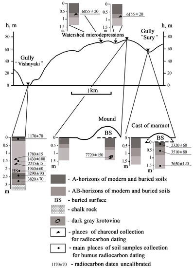 The age of immature soils and colluvial layers in the colluvial fan “Vishnyaki” gully and in the lower part of the slope adjacent to the “Sury” gully was determined by radiocarbon dating for several depths. The ages of all other layers were calculated. To calculate the age, the difference between the ages of two subsequent layers was divided by the thickness of the layers between them, assuming that the accumulation rate was constant during the time period of the layer accumulation. Also, the radiocarbon dates obtained for the soil organic matter were corrected by subtracting the mean residence time of carbon in the soil organic matter, which is about 1100 years for the layer 0–20 cm of the forest-steppe Chernozems [4]. We understand the low precision of this way of dating but in the most cases we had no other possibilities for dating of our objects as no another carbonaceous material, except soil organic carbon, were found there.