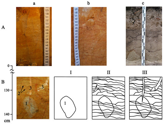 (A) lamellas in the lower part of the modern (a) and buried (b) Chernozems of the Yamskaya steppe, and (for comparison) in the profile of the Gray Forest Soil (Phaeozem) on sandy loam, forest-steppe of the Central Russian Upland (c); (B) fragment of a lower part of the buried Chernozem with heterogeneous signs: 1—traces of tree roots, 2—lamellas, 3—shrinkage cracks, filled with carbonates. I, II, III–stages of these features formation.