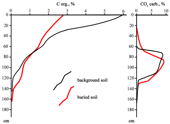 Profile distribution of C org and CO2 of carbonates in the Chernozem buried under the Bronze Age burial mound (red line) and in the modern Chernozems (black line).