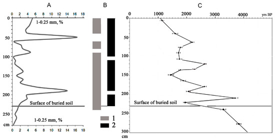 Distribution of sand fraction in the colluvial stratum of “Vishnyaki gully” (A); occurrence of pollen, spores, and phytoliths in the stratum (B); Radiocarbon age of soil organic matter (uncalibrated years) in different layers of the colluvial stratum and in the buried soil (C). 1—layers with presence of pollen and spores; 2—layers with presence of phytoliths; 3—peaks of the sand content; 4—peaks of the soil C org radiocarbon age.