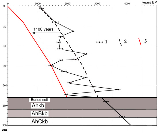 The trend line of the age-depth curve of colluvial strata, minus the mean residence time of the organic carbon in Chernozems (1100 years according to [4]), shows an approximate distribution of the age of colluvial layers in the studied section (Figure 7).