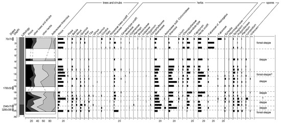 Of all the samples processed for the palinological analysis from the buried Chernozemic soil, only two samples contained a sufficient amount of pollen. One of them was from the upper 20 cm layer of the buried Chernozem, and the other was from an in-fill of a mole rat tunnel (krotovina), at the depth of 130 to 140 cm from the buried surface. The dark-colored soil infilling of the krotovina yielded a radiocarbon age 7720 ± 150 years BP (Ki-17788) (Figure 3). It is known that the amount of plant pollen in buried soils is maximal in their uppermost layers, reflecting palinological spectra of the day surface at time of burial. Usually pollen is not preserved in deeper soil horizons [44]. However, pollen can be embedded deeper as a result of backfilling the mole rat tunnels with the material of the upper soil horizons.
