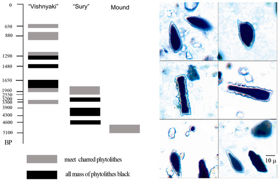 The second ancient evidence of anthropogenic impacts on the natural environments is the presence of macro- and microcharcoal and charred of grasses. The oldest finds of the charred materials dated by ~4600 years BP were found in the surface horizon of the Chernozem buried under the burial mound of the Bronze Age and in the Chernozem buried under the marmot mound at depth of 120–130 cm (Table 4). The evidence of repeated fires in the catchment area of the “Vishnyaki” gully was found in a number of layers, with charred phytoliths dating back to 1800 years BP and charred grass remains dated by 3200 years BP. The evidence for a recurring burning in three study sites is shown in Figure 9.