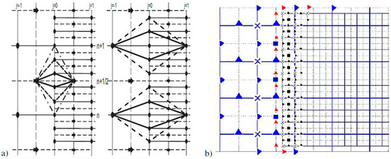To refine the spatial grid, we use the Fast Fourier Transform (FFT) based interpolation. Let us explain this procedure for a 2D problem. The mutual disposition of a coarse and fine spatial grids is presented in Figure 2b), which corresponds to updating the stresses by velocities (updating velocities by stresses is implemented in the same manner). As can be seen, to update the stresses on a fine grid it is necessary to know the velocities at the points marked with small (red) triangles, which do not exist on the given coarse grid. Using the fact that all of them are on the same line (on the same plane for 3D statement), we seek the values of missing nodes by FFT based interpolation. Its main advantages are an extremely high performance and exponential accuracy. It is this accuracy allows us to provide the required low level of artifacts (about 0.001 with respect to the incident wave) generated on the interface of these two grids. For 3D statement, we again perform the FFT based interpolation but this time 2D.