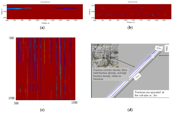 Sketch of the reservoir. (a–c)—side and top views. (d) Upscaling of the fractures to fracture corridors.