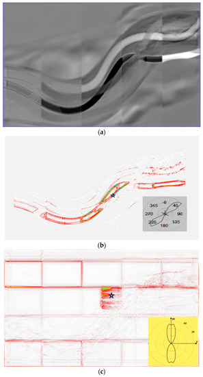 At the Figure 9b (right bottom corner) we show the so-called diffraction rose-diagram for a point marked by a star on the diffraction image. The rose diagram determines the direction of maximal diffraction energy corresponding to the tangent to the channel and, hence, indicating the “edge diffraction” [14].