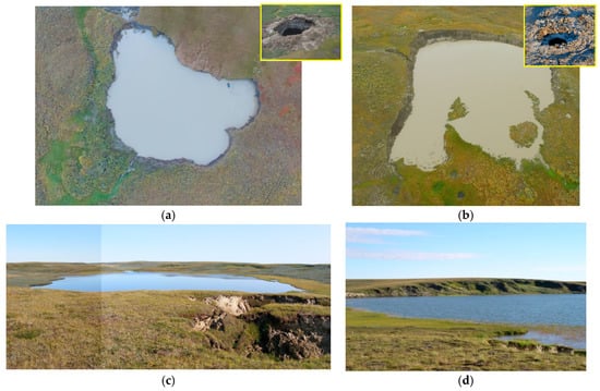 Gas emission crater (GEC) lakes and background lakes in Central Yamal: (a) the lake GEC-1 (the photo in the insert shows the initial state of GEC-1); (b) the lake GEC-2 (the photo in the insert shows the initial state of GEC-2); (c) background Lake 001; (d) background Lake 015.