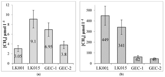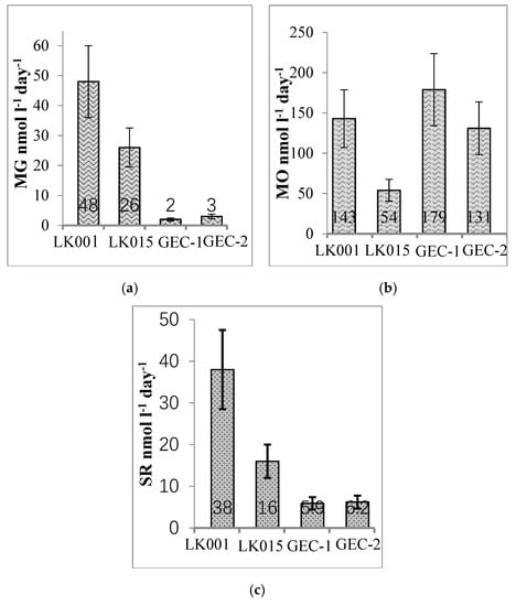 In the bottom sediments of the background lakes, the rates of MG were small (26–48 nmol∙C∙L−1∙day−1) and corresponded to the known interval (50–400 nmol∙C∙L−1∙day−1) for the winter season [23]. MG rates in the GEC sediments were very low and close to the resolution of the method (Figure 5a). The rate of MO in the bottom sediment layer of lake LK001 was similar (131/179 nmol l−1 day−1) to those found in both GEC lakes (Figure 5b). However, the MO rate in the lake LK015 was 3 times lower (average value 54 nmol∙L−1∙day−1). The SR rates ranged from 6 to 38 nmol∙L−1∙day−1 (Figure 5c), and were 3–6 times higher in the sediments of the background lakes compared with the GEC lakes.