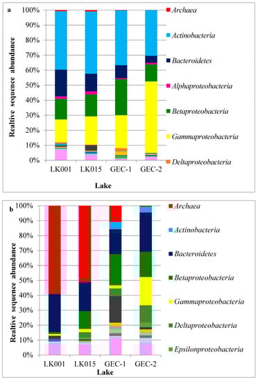 Microbial diversity in the bottom water (a) and upper sediment layer (b) of the Yamal background lakes (LK001, LK015) and gas emission craters (GEC-1, GEC-2) as determined by high-throughput sequencing of the 16S rRNA gene fragments (April 2018).