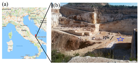 (a) A map of Italy showing the location of Poggio Imperiale (Google Maps), (b) A panoramic view of the quarry; the blue star refers to the surface of the bench under study.
