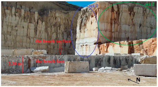 The rock mass of the bench was characterized by two sub-vertical sets of fractures, identified as Set 1 and Set 2 (Figure 2). Set 1 refers to the fractures propagating parallel to the bench face under study (strike direction to North-West), whereas Set 2 refers to the fractures propagating perpendicularly to the bench face under study (strike direction to South-West). As evident in Figure 2, the spacing of the fractures in Set 1 was larger than that in Set 2, allowing the quarried blocks in this bench to have a marketable size. The aperture size of the out-cropping fractures ranged from about 0.2 cm to 3.0 cm. The rock mass layering could not be observed visually on the bench face, whose height was 2.30 m, due to the chemical blasting effect (black and white stripes) on the appearance of the bench face (Figure 2) and to the thin-aperture bedding planes between the layers, as shown in the side view of the bench (Figure 3). However, the layers in this quarry were clearly stratified parallel to the bench surface.