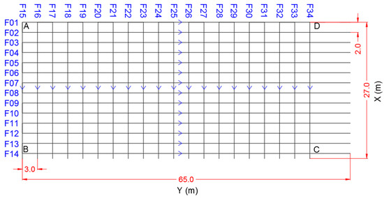 A three-dimensional rectangular GPR survey grid was designed with four vertices named A, B, C, and D, as shown in Figure 4. The A–B vertex was parallel and 3.0 m away from the bench face, since most of the neglected area within these 3.0 m was full of stone debris. The bearing of the A–B side was 345.0° from the North. The dimensions of the rectangular grid were measured through a 1.0 cm accuracy tape. An arithmetical check was performed on the lengths of the diagonals, A–C and B–D, before the survey, to make sure that the rectangular was geometrically correct. We collected 14 profiles (from F01 to F14) with 2.0 m spacing along the X direction, and 21 profiles (from F15 to F34) with 3.0 m spacing along the Y direction. The length of each survey line in the X direction was equal to 27.0 m; whereas, in the Y direction it was equal to 65.0 m. During the survey, the locations of each antenna bumping were recorded in hand-writing in the field notes, to then be later considered in data processing and interpretation.