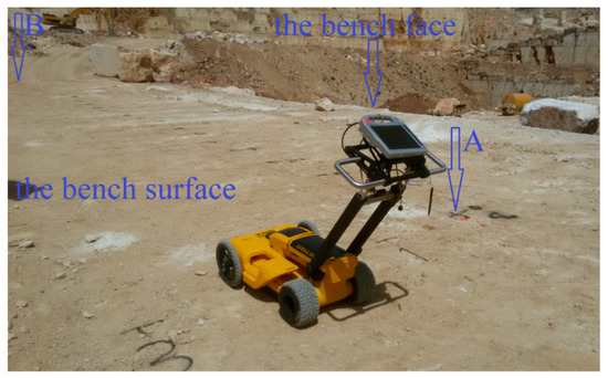 The bench surface was reasonably flat, and thus suitable for the GPR survey activities. The rock mass of the bench was slightly wet since the GPR survey was carried out 8 h after the end of 10-h of light rain. However, the surface of the bench was dry due to the sun drying the area after the rain. The surveying was carried out on a day characterized by a temperature of 14 °C and a relative humidity of 71%.