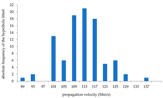 Histogram of the propagation velocities measured through the fitting hyperbola method. The propagation velocities in the X axis of the chart were plotted in a bin of 4.0 Mm/s.