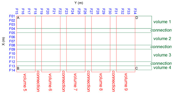 This study used the interpretation and modeling method presented in [1]. The surveyed area of the bench was divided into nine volumes referring to the radargrams in the X and Y directions, as shown in Table 1 and Figure 7. The fractures in each volume were interpreted and modeled separately. The fractures were then traced and modeled in the connections between the volumes. Appendix A shows two volumes interpreted from the radargrams in the X and Y directions. It is worth mentioning that, in this case study where vertical or sub-vertical fractures intersect with the bedding planes, interpretation of a vertical or sub-vertical fracture may not belong to one fracture but to several fractures (usually one fracture per mechanical layer): One starts very close to the point where the other ends.