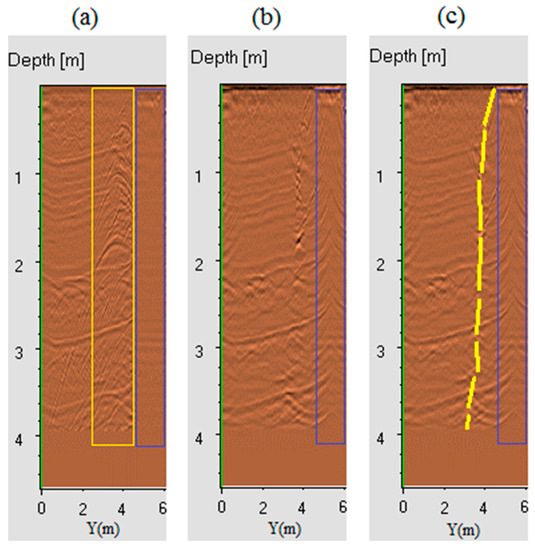 In this case study, only the 700 MHz radargrams were considered since such frequency provided enough penetration depth with a higher resolution compared to the 250 MHz radargrams. Standard signal processing functions were applied to the 700 MHz radargrams using the signal processing software package GREDTM (manufactured by IDS GeoRadar s.r.l., Pisa, Italy). Firstly, the zero time was corrected manually. The background noise was eliminated by applying a horizontal background removal filter. This command applies the Clear-Y filtering algorithm to remove continuous components along the Y axis (horizontal direction) using two preset parameters to identify the depth of implementation in the radargram. The minimum value of the preset parameters was equal to 0.0 m (depth), and the maximum value was equal to 4.0 m (depth). The frequencies were filtered vertically through a vertical bandpass filters tool. Data were bandpass filtered in the 200 to 1500 MHz band. A power equalization of the amplitudes on the basis of an automatically estimated linear attenuation was carried out through the linear gain function, followed by an automatic smoothing gain filter to equalize the power along a sweep for a moving window. Finally, by selecting a proper color scale and adjusting the display gain, it was possible to spot some lower amplitude regions.