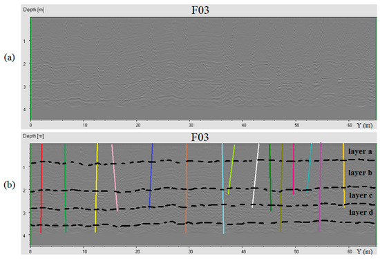 (a) Radargram F03 processed without any interpretation; (b) Radargram F03 processed with the interpretation of the detected layering (black dashed lines) and the detected sub-vertical fractures (different colors).