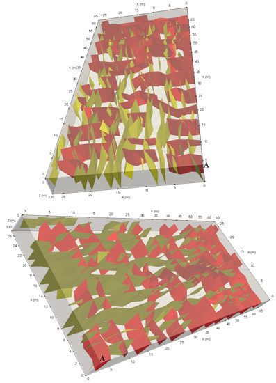 The fractures were modeled in a rock mass body measuring 27.0 m X, 65.0 m Y, and 4.0 m Z. The polygon file format (PLY) [32] of the fracture data and the surveyed volume were imported in ParaView [33] for a 3D visualization (Figure 10). As shown in Figure 10, the two sets of fractures were somehow orthogonally intersected. The fractures detected in the radargrams of the X and Y directions are represented in the model in yellow (Set 2) and red (Set 1), respectively. As shown in the visualized model, fractures belonging to a fracture set had noticeable variations in space. However, the general trend of the dip direction, dip angle, and spacing still clearly defined the two fracture sets. The visualized model provided some indications that Set 2 was the dominant one.