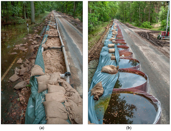 The disadvantages of SBRSs compared to sandbagging are, on the one hand, the high acquisition costs. However, when properly stored and maintained, SBRSs are completely or to a large extent reusable, whereas sandbags and sand must be disposed of separately and at high cost after use. In addition, there is the risk of vandalism or damage from external influences, especially with water- and air-filled SBRSs. Sandbags are comparatively easy to handle and their functionality has been proven over many years [5]. SBRSs, on the other hand, require trained personnel for installation and their use in flood defense is little known. However, SBRSs were used sporadically during the Elbe flood in 2013 (Figure 2).