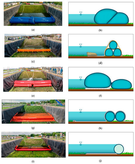 Tube systems tested in the IWA test facility, (a) Hydrobaffle (water-filled), (b) schematic diagram of the Hydrobaffle system, (c) Tiger Dam, (water-filled), (d) schematic diagram of the Tiger Dam system, (e) Flutschutz Doppelkammerschlauch (DKS) (water-filled), (f) schematic diagram of the Flutschutz DKS system, (g) Mobildeich, (water-filled), (h) schematic diagram of the Mobildeich system, (i) Öko-Tec (air-filled), (j) schematic diagram of the Öko-Tec system.
