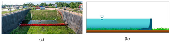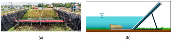 Comparisons of SBRSs and sandbag systems as well as the possibility of significantly shortening the construction time of a flood barrier by using SBRSs are frequently cited in the literature (e.g., [13,14,15]). Various SBRSs have been tested since 2010, mainly on behalf of manufacturers, at the TuTech Centre for Climate Impact Research—KLIFF—at the TU Hamburg, Germany. These tests have mostly been conducted according to the criteria set forth in the test guidelines of the ANSI/FM Approval 2510 flood abatement equipment test standard. The tests took place in a test basin on a smooth concrete surface [16], which provided comparatively good underlying surface conditions for many of the constructions tested. Information on the tests has only been published in parts by the manufacturers (e.g., [17,18,19]).
