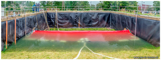 The test setups were carried out in the IWA test facility, which was developed as part of the DeichSCHUTZ research and development project funded by the German Federal Ministry of Education and Research (BMBF). The IWA test facility consists of a 3.5 m high U-shaped basin. A 3.0 m high dyke closes the 15 m wide opening. The basin can be filled with water, so that the load on the dyke or on installed flood protection systems by high water levels can be simulated. The basin floor consists of an approximately 1 m thick alluvial clay layer, on which topsoil and grass are applied to simulate the usual soil structure found in the middle and lower reaches of river basins. For the SBRS tests, the systems were constructed parallel to the dyke line over the entire width of the basin. The space between the dyke and the system was then filled with water (Figure 3). Owing to the hydrostatic pressure generated in this way, the hydrostatic load could be realistically simulated. The IWA test facility is not able to investigate other load variables such as current, waves, wind, flotsam, or vehicle impact, and environmental influences.