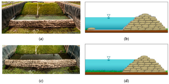 Sandbag flood protection system. (a) Sandbag dam with protruding plastic apron (b) schematic diagram of the sandbag dam with protruding plastic apron, (c) Sandbag dam without protruding plastic apron, and (d) schematic diagram of the sandbag dam without protruding plastic apron tested in the IWA facility.