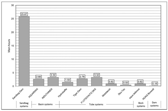 The required construction times of the sandbag dam and the SBRSs for a 15-m-long protection line and a protection height of 0.60 m are shown in Figure 10. Converted into man-hours, a comparison shows that the installation of the SBRSs is many times faster than the construction of a conventional sandbag dam, which takes about 26 man-hours. Due to the comparatively large volume of water required to fill the construction, the 3.3 man-hours needed to install the FLUTSCHUTZ-DKS is the longest among the SBRSs. Compared to the 26 hours required to build the sandbag dam, however, the time needed—one eighth of this—is relatively short.