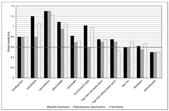 System dimensions, water heads according to manufacturers’ specifications, maximum water heads achieved during tests with location-independent mobile flood protection systems; the red line indicates recommended water heads according to BWK [20].