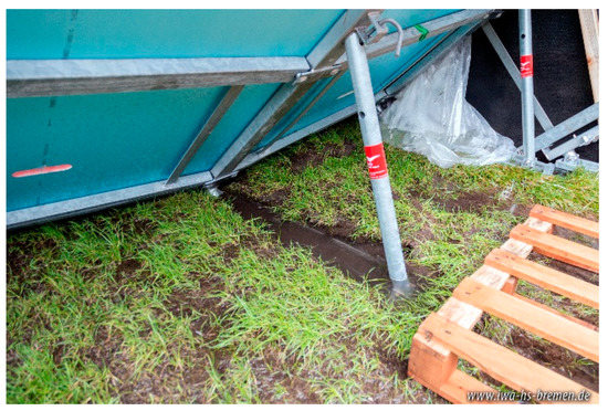 After reaching a steady seepage rate at a dam height of 0.6 m, the water level was successively raised to test the possible dam heights according to the manufacturer’s specifications and to determine the maximum load limits until failure of the systems on underlying turf. Figure 11 shows the system heights (black bar), the water heads specified by the manufacturers (grey bar), and the maximum water heads determined during the tests (light grey bar). The diagram shows that most of the tested systems fulfil the required 0.6 m (red line) in accordance with BWK recommendations [20]. Only the Tiger Dam was unable to achieve the required 0.6 m without a protruding plastic apron, whereas the variant installed together with a protruding plastic apron could be overflowed and achieved a maximum water head of 0.8 m. According to the manufacturer, the use of a protruding plastic apron is not mandatory for the construction of the Tiger Dam. However, based on the experience of the tests we carried out, one should always be used. The test results for the aqua defense system showed that the maximum water head specified by the manufacturer could not be achieved. The reason for this is that the supporting feet sank into the softened ground (Figure 12). However, it was possible for the system to overflow (Figure 13). The results of the Öko-Tec and Mobildeich tube systems showed that the maximum water level was higher than that of the systems. This is because the height of the system refers to the deployed system in the absence of hydrostatic load. As a result of the water impoundment, the tube systems in particular experienced a deformation due to horizontal water pressure, which had a positive effect on the system height and thus enabled a higher water head than that specified for the system.
