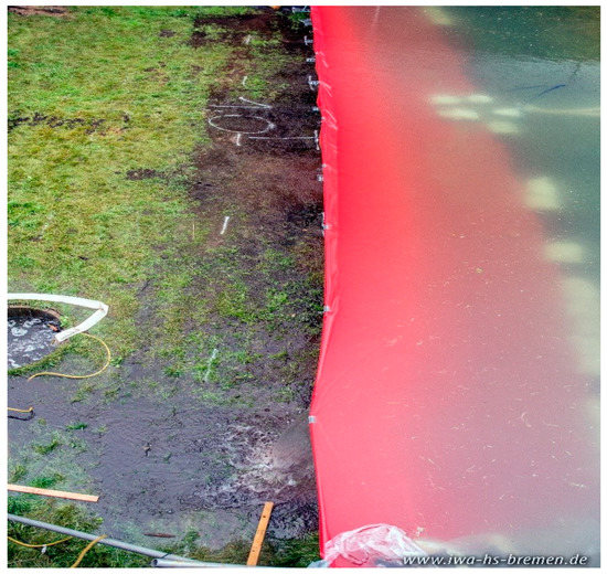 After reaching a steady seepage rate at a dam height of 0.6 m, the water in the basin was impounded in stages until system failure due to a water head exceeding the load limits of the system was reached or the system started to overflow. However, if the SBRS tested could withstand full impoundment or even overflow, these load cases could not be realized over the entire system length due to the unevenness of the basin floor and limited pumping capacity. Because of such unevenness, only a slight overflow height could occur on the left-hand side of the IWA test facility—viewed from the dyke (Figure 8).