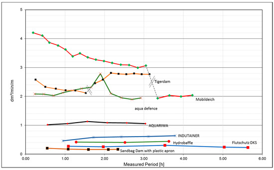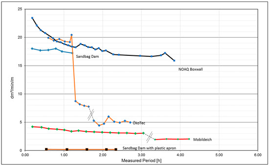 Figure 15 shows only the seepage rates of the low permeability SBRSs, so that a better comparison of the less permeable systems is possible. The seepage rate of the Mobildeich system (red line with green dots), which gradually decreases, stands out from the other systems. Here, a steel chain is used to weigh down the protruding plastic apron, which, due to its relatively low weight, only presses itself further into the underlying turf over time as the soil becomes softer before achieving an improved seal. A reduction in the seepage rate over time was also observed with the Tiger Dam (orange line with black dots), but the seepage rate increased slightly again from 2.1 dm3/min/m to 2.8 dm3/min/m during the measurement pause at night—shown by the interruption in the data line—after a slight shift in the construction at the edge connection. This was due to a slight displacement of the system at one edge connection, which allowed somewhat more water to pass through. It was not possible to rectify this fault while the basin was still full. The larger systems in terms of geometry, such as the FLUTSCHUTZ-DKS (light blue line with red dots) or the Hydrobaffle (green line with red dots), showed a lower permeability due to their higher weight and subsequent better seal to the underlying turf, and they are comparable with the sandbag dam fitted with a protruding plastic apron in terms of seepage rate.
