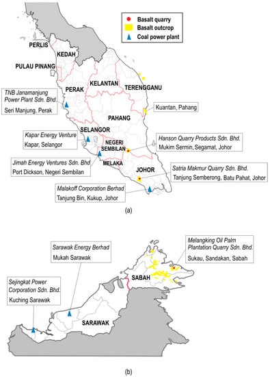 Map of (a) Peninsular Malaysia (adopted from https://openclipart.org/detail/290360/peninsular-malaysia-blank-map) and (b) East Malaysia showing locations for basalt quarry, basalt outcrop, and coal power plant. Information regarding basalt quarries and outcrops was derived from Department of Mineral and Geoscience Malaysia [71] and, regarding coal power plants, was derived from https://endcoal.org/global-coal-plant-tracker/.
