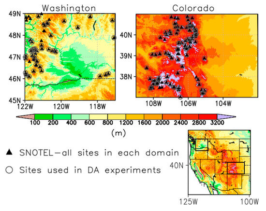 The study domains span the mountainous regions of Washington (WA) and Colorado (CO) states within the United States. The spatial grid is on an equirectangular projection with a resolution of 0.01 degree (~1 km) with bounding coordinates of the lower left corner (45.005° N, −121.995° W) and upper right corner (48.995° N, −116.995° W) for WA (400 latitudinal and 501 longitudinal points), and lower left corner (37.005° N, −108.995° W) and upper right corner (40.995° N, −102.005° W) for CO (400 latitudinal and 700 longitudinal points). The 0.01° gridcells are represented at the center of the gridcell, as reflected in the bounding coordinates. Figure 1 highlights the WA and CO study areas, depicting the areas’ high topographic variability (e.g., mountainous and low-land areas). The 0.01° elevation maps are derived from the 30 m U.S. Geological Survey (USGS) National Elevation Dataset (NED; https://lta.cr.usgs.gov/NED). Also, these areas have a wide range of soil and vegetation types (e.g., coniferous forests, grasslands, agricultural, etc.). The regions were selected to capture not only the topographic variability, but also variability in surface snow amounts. Figure 1 also shows each region’s associated in-situ U.S. Department of Agriculture’s (USDA) Natural Resources Conservation Service (NRCS) SNOwpack TELemetry (SNOTEL) measurement networks used in this study. After additional quality-control checks, 56 SNOTEL stations are identified as being within the WA domain, and 98 SNOTEL stations are within the CO domain (represented by black triangles). These stations are used in deriving and the new SDCs, as described in Section 4.1.