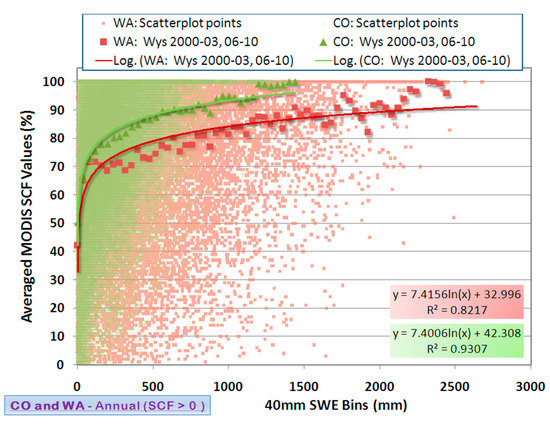 Figure 2 shows the range of MODIS SCF values (y-axis) in relation to the SNOTEL SWE points (x-axis) as scatter points. The large range of observed SCF and SWE values is noted here as a representative of the different snowpack and cover conditions that can occur in mountainous regions, e.g., low SWE amounts with high SCF during the accumulation phase. MODIS SCF values of 0% are excluded, and zero-valued SWE values are not included in the 40 mm bins. Some bins are removed from the curves if less than five MODIS SCF measurements were in a bin or were considered extreme outliers, resulting in a total of four bins removed for WA region and one for the CO region. The WA region scatterplot points (red) reveal much higher SNOTEL SWE values (greater than 2500 mm) than the CO SWE points. Since the points are scattered and weighted in a logarithmic fashion, logarithmic functions were fitted to the points to estimate relationships between the values. The WA logarithmic-regression line (red) indicates less change in SCF as SWE increases than the CO regressed line (green). Regression equations and coefficient of determination, R2, values are highlighted in the lower right-hand corner boxes, where the red (green) box corresponds to WA (CO). The logarithmic equations and R2 values shown here were generated within a Microsoft Excel Spreadsheet analysis. For the binned average values, logarithmic functions are linearly regressed onto them, producing high R2 values: 0.822 and 0.931 for WA and CO, respectively. With binning the SWE observations and averaging the corresponding SCF values within each bin, much of the high data variability and spread is reduced with the binned averages, thus providing a greater “signal”, as reflected with the R2 values.