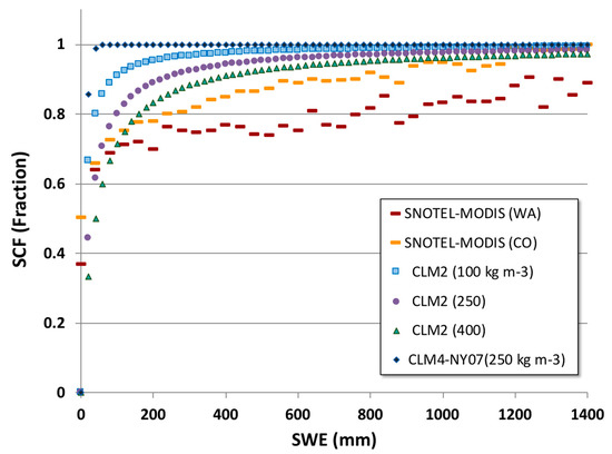 In this comparison, the CLM2 range of density-dependent curves tend to have a greater rate of change in SCF for the first 400 mm of SWE in relation to the range of observation-based points (for both WA and CO). These differences translate into how model predicted SWE is converted into predicted SCF for the EnKF updates. In addition to the default CLM2 SDC function, the CLM version 4 (CLM4) SDC function, developed by Niu and Yang (2007; referred here as NY07), is included in Figure 3, using its default settings that have been used in some global climate model simulations [17] and snow cover DA studies [13]. For the CLM4 curve, only the bulk snow density of 250 kg m−3 was used, and shown in Figure 3; however, observation-based snow densities have been estimated to be between 175 and 320 kg m−3 at coarser scales (at 1.0° × 1.0°) by Niu and Yang [20]. For their data assimilation experiments, Su et al. [13] tuned the melt factor shape parameter and set the minimum snow density to 100 kg m−3. The main difference in the CLM4 equation and that used in CLM2 is that the CLM4 hyperbolic tangent function reaches a value of 1, whereas the CLM2 function only approaches 1. Other studies have used the NY07 SDC type formulation for snow cover DA experiments, and either tuned the parameters or used the default model formulation [16].