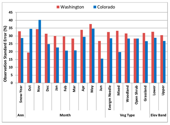 For the different temporal and physiographic type observation-based operators, corresponding observation standard errors, σtotal, were also estimated by using these new logarithmic curves along with the available SNOTEL SWE and MODIS SCF observations for the period, WYs 2000–2003 and 2006–2010, which is outside of the data assimilation experiment window. The new σtotal values are calculated for the different monthly, vegetation and elevation conditions and for each region by inputting the SNOTEL SWE values in to the new logarithmic functions and then compared to the MODIS SCF estimates. This is again to capture both the errors in the SCF detection rates and newly derived observation operator functions. As shown in Figure 4, the results for both CO (blue bars on the right) and WA (red bars on the left) are compared side-by-side to examine the regional differences in the estimated observation errors. CO-associated errors are lower overall than WA, especially during the winter months. When these observational errors are lower, again more dependence on the observations is given, and thus through the EnKF updates, the model will draw closer to the observations. Stronger responses to the SCF observations are then expected in CO than in WA region for the DA results.