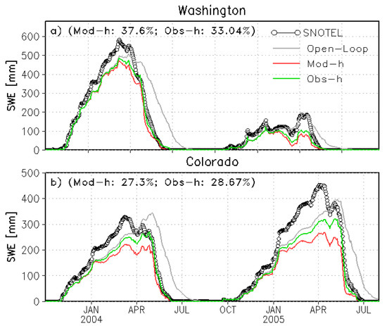 Spatially averaged SWE comparison is made between SNOTEL observations (open circles), the OL run (grey line), model-h EnKF experiment (red line), and obs-h EnKF (green line) experiments for both (a) WA and (b) CO regions. Values given within the parentheses indicate the σtotal values for the experiment.