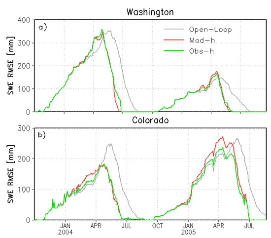 Spatially averaged RMSE SWE values (in mm) for both (a) WA and (b) CO for the OL run (grey line), model-h EnKF (red line) and obs-h EnKF (green line) experiments.