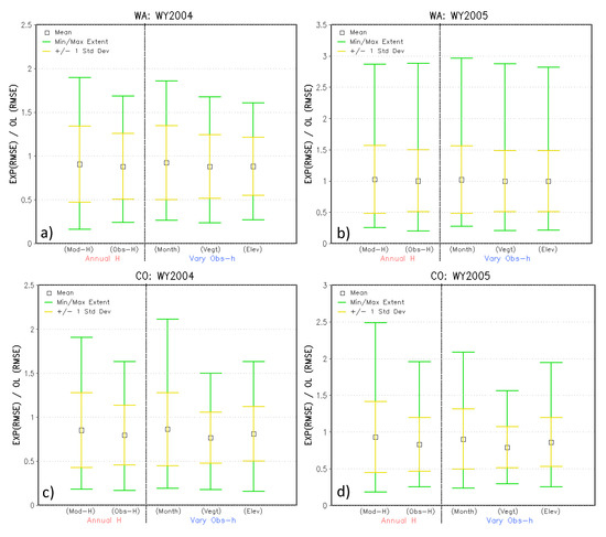 Comparison of each experiment’s SWE RMSE values normalized by the open-loop (OL) RMSE values for the five experiments: Model-h EnKF run, and the annual, monthly, vegetation, and elevation varying obs-h EnKF experiments for WA (a,b) and CO (c,d) for WY2004 (left) and WY2005 (right). Black open squares indicate the statistical mean, yellow error bar lines indicate ±1 stdev unit from mean, and green error bar lines indicate the maximum and minimum extents of the normalized statistic. Values below 1 suggest improvement over the OL run.