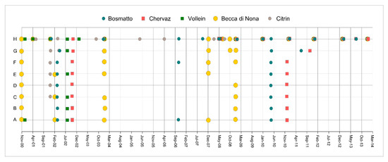 Time distribution of the data available for each considered landslide, divided in the eight recognized topics: (A) GeoGeomS; (B) GeoM; (C) GeomM; (D) SrtM; (E) GeoP; (F) Hyd/Hydg; (G) Rsk/Sc; and (H) MonNet.
