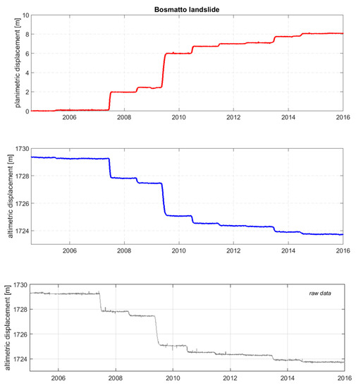 Bosmatto landslide elaborated time series of planimetric and altimetric displacement measured by global positioning system (GPS) for the entire monitored period. In the bottom, the raw dataset of altimetric displacement.