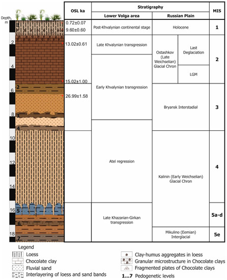 The Srednaya Akhtuba section is a unique exposure representing the most complete sequence of Late Pleistocene continental and marine deposits interbedded with seven pedogenetic levels from MIS 5 to MIS 1 (Figure 2, [1,4,15,17,18,19,20,21]).