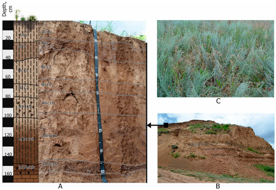 Srednaya Akhtuba study site. (A) Calcic Kastanozem; (B) General view of the Srednaya Akhtuba outcrop, with the pedosedimentary sequence presented in Figure 2; (C) Sagebrush vegetation typical for dry steppe.