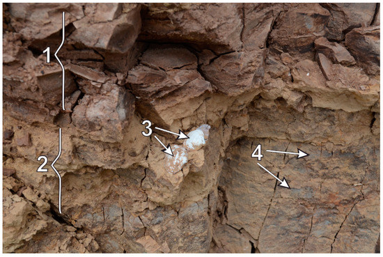 The facies of Chocolate clays: 1—mono clay layers of “Chocolate color”; 2—interlayers of thin yellow sands with mollusk shells; 3 and 4—gray fine silty coatings on the surface of fine prismatic structural units.