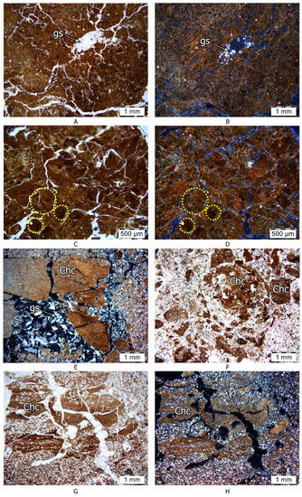 Sub-areal transformation of Chocolate clays. (A,B)—high birefringence and monostriated b-fabric of the micromass, granular microstructure, and gypsum crystals(gs) in pores (155 cm; (A)—PPL; (B)—XPL); (C,D)—rounded biogenic aggregates (155 cm; (C)—РPL, (D)—XPL); (E)—heterogeneous fragments of Chocolate clays(Chc), splitting of clay plates by gypsum(gs) crystals (100–148 cm, XPL); (F)—biotubula with fragments of Chocolate clays(Chc) (100–148 cm, РPL); (G,H)—fragmented plates of Chocolate clays, disintegrated by biogenic pores, in sorted silty micromass (100–148 cm, (G)—РPL; (H)—XPL).