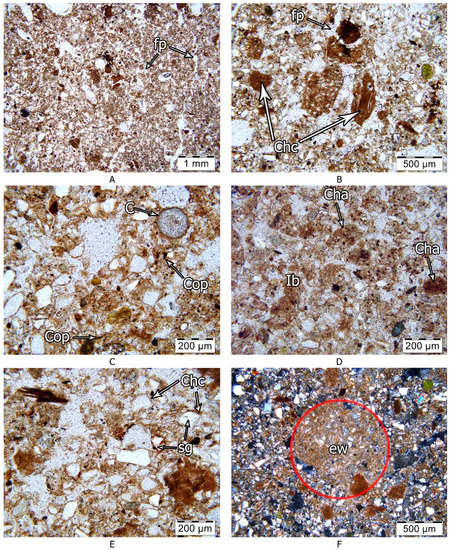The microstructure of the lower part of the loess layer (80–100 cm): (A)—silty material with abundant fine pores (fp) and granular microstructure. Note abundant fragments of Chocolate clays of fine sand and coarse silt size. PPL; (B)—the same with higher magnification. Note clay fragments (Chc) of various shapes, colors, and grain sizes, and the presence of glauconitic grains, PPL; (С)—spore covered by clay coatings (C) and abundant coal particles (Cop), PPL; (D)—clay-humus aggregates(Cha) and colonies of iron bacteria(Ib), PPL; (E)—clay-humus coatings (Chc) on sand grains (sg), PPL; (F)—earth-worm (ew) cast filled with carbonate material of Chocolate clay, XPL.